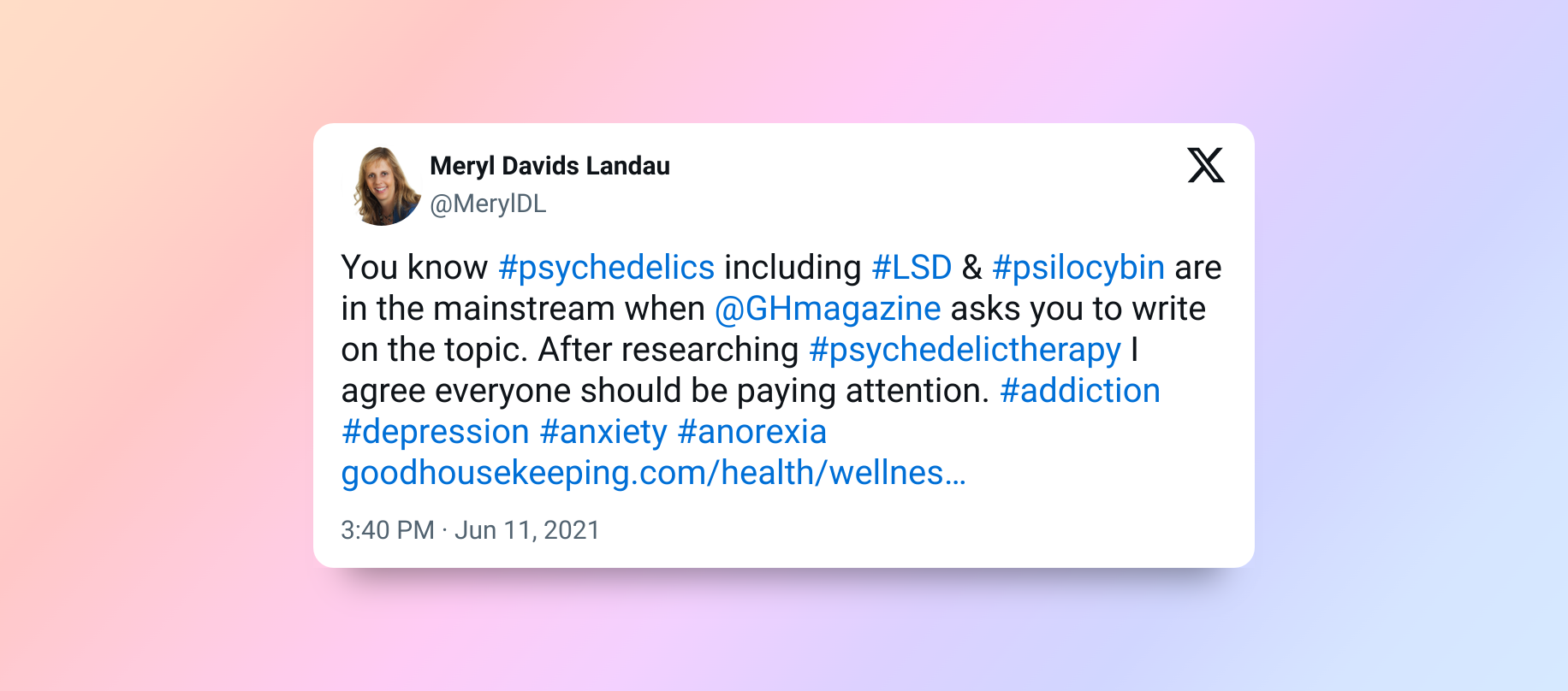 But Meryl did not consider writing about psychedelics until she received a call from an editor at Good Housekeeping. She was commissioned to write a feature about how illegal drugs like LSD, magic mushrooms and MDMA are being studied to treat addiction, depression, anxiety and eating disorders.